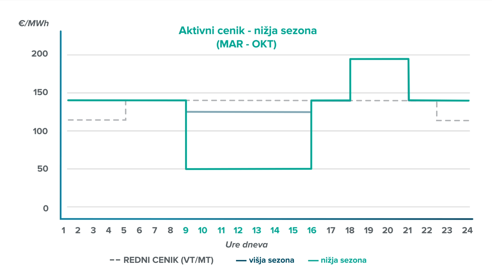 V primerjavi z rednim cenikom z višjo (VT) in manjšo tarifo (MT) Aktivni cenik elektrike za mala podjetja omogoča bistveno ugodnejšo ceno električne energije v sončnih urah, ko je proizvodnja iz obnovljivih virov največja. V nižji sezoni, ki traja osem mesecev v letu, je 7 ur v dnevu cena elektrike skoraj 3 krat nižja od VT cene pri rednem ceniku, kar odjemalcem omogoča občutne prihranke ob prilagajanju porabe.